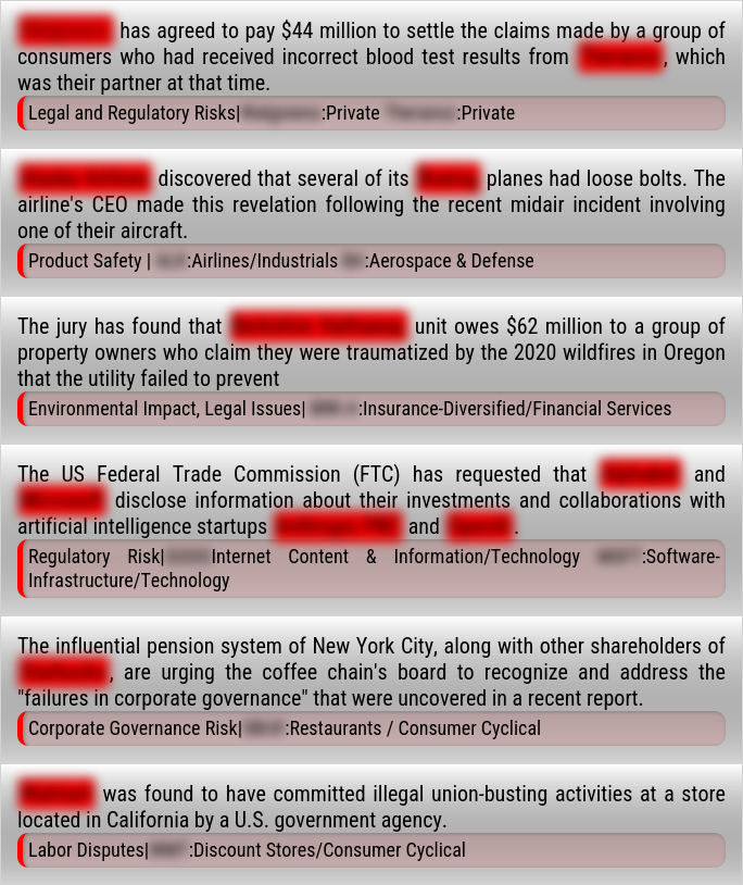 The "Media Risk" feature of our AI financial news service is designed to detect and track events or situations that may impact a corporate reputation or brand, based on actual or alleged involvement in adverse activities as reported by the media. This can help identify potential threats to investments in affected companies, and enable investment/risk/media relations teams to stay ahead of emerging topics and narratives that could significantly affect companies or even entire industries. With this feature, teams can capture more nuanced themes and quickly evaluate what actions should be taken to protect investments when issues arise.
